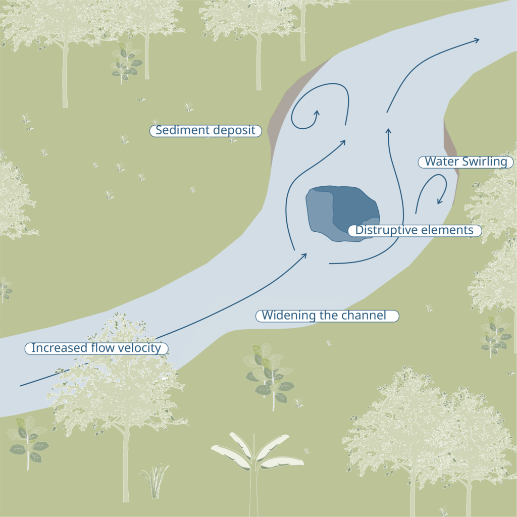 (-) Disruptive elements can block the river flow if placed without proper analysis