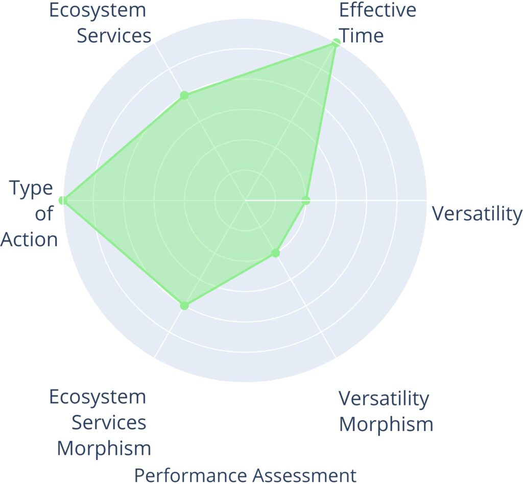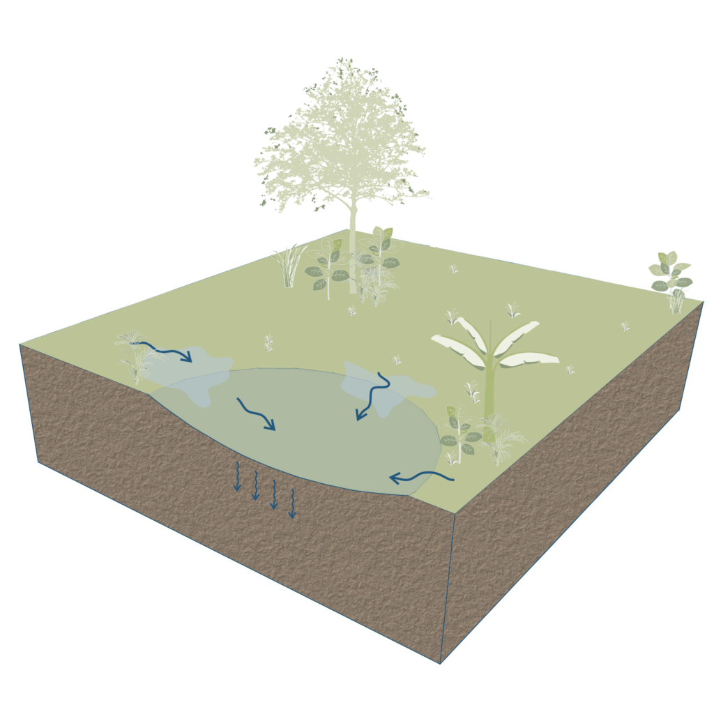 Dry detention ponds are vegetated detention basins designed for short-term temporal water storage during heavy rain occasions. Stormwater fills up the detention pond and detained water then flows into the sewer system. In periods of no heavy rainfall, the detention ponds are dry and can be used as public green areas. The natural landscape in which the detention pond is being implemented contains a heterogeneous surface with slightly elevated areas and lower parts in proximity, forming a mosaic of micro conditions. Water stays in the lower parts for some time until it infiltrates or evaporates.