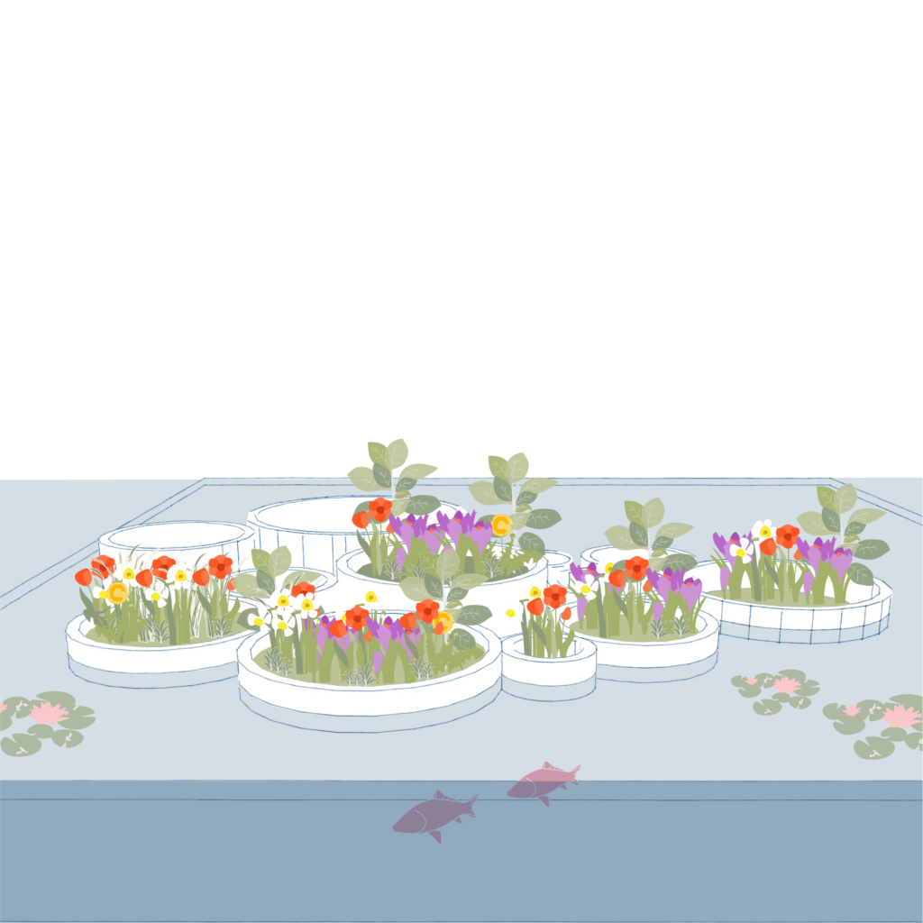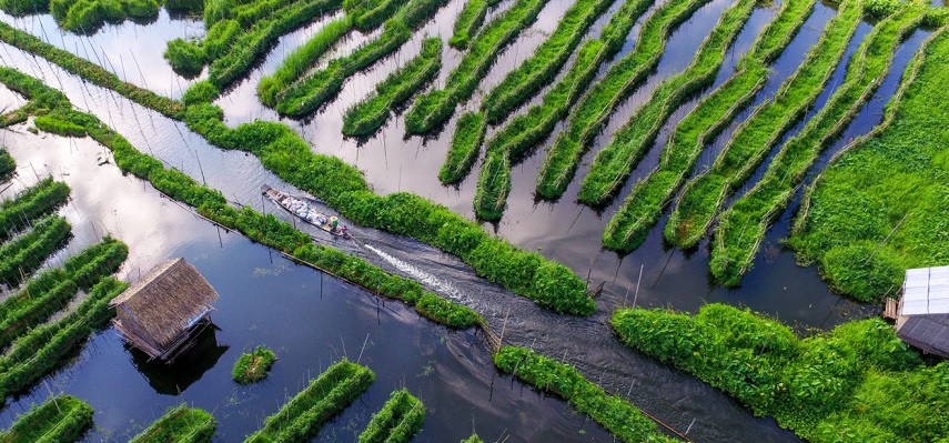 Floating gardens typically consist of rafts that enable certain plants to be grown hydroponically, with their roots extending into the water. These gardens can be used for growing vegetables, for decorative purposes, or both.