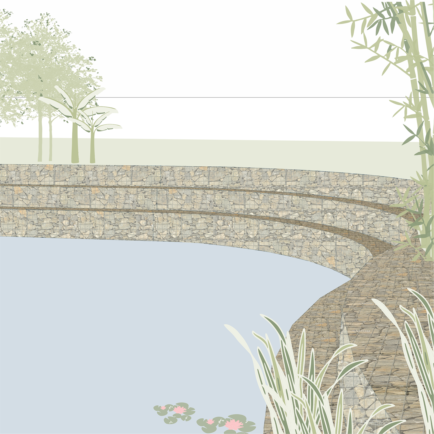 Penggantian bantaran sungai berbahan beton dengan dinding Terramesh. Terramesh adalah anyaman kawat yang digunakan sebagai sistem perkuatan tanah untuk menstabilkan lereng.